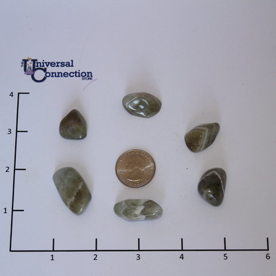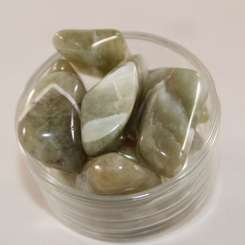 This Polished Prasiolite is light olive green with white banding, and is also known as Amegreen. It is a combination of