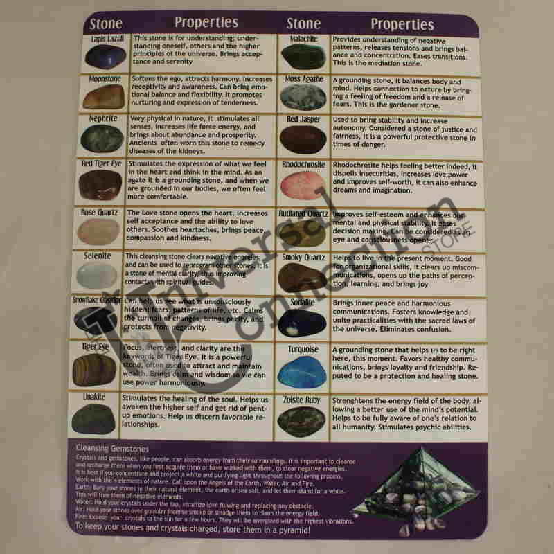 Our laminated double-sided stone chart pictures our most popular tumbled stones and lists their metaphysical properties. ie: Angelite, Amazonite, Amethyst (Available in English, Spanish) 11"x8.5"