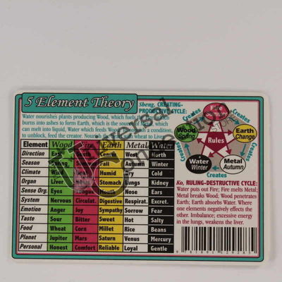 Chi is the Life Force Energy of all nature. Chi grows the plants, flows the rivers and is the divine spirit in everything around us. Chi is organized into the 5 elements that sustain life; Wood, Water, Fire, Metal and Earth. This wallet card is the perfect guide for beginners. 3" x 2"