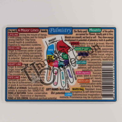 Palmistry has been around for thousands of years. Palmistry, or Chiromancy, is the art of reading hands to gain insight into conscious and subconscious aspects of a person. It is also used as a form of divination predicting the future by interpretation. Whatever your intention, much can be revealed by the blueprint of your hands. 3" x 2"