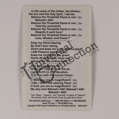 The Threefold Flame or Divine Spark is the seed of the Divine within our heart chakra. The flame embodies the same love, wisdom and power that manifest in the heart of the I AM presence, and in the heart of your higher self. Carry this card and printed decree to connect with the Divine anytime. 3" x 2"