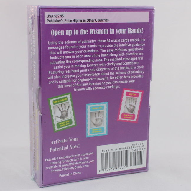 Includes: 54 Oracle Cards, 4" x 6", 140 page paperback guidebook, 3x magnifier. New one-of-a-kind card deck based on the science of palmistry! Each card features a unique message based upon hand features. 54 card deck color-coded to teach you about palmistry.