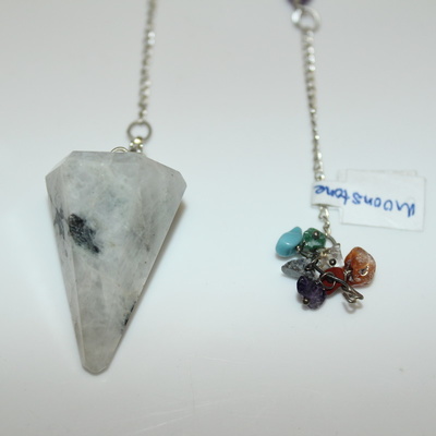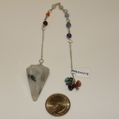 Pendulums are often used for divination, spiritual healing and inner growth. This hexagonal shaped Moonstone, having the 7 colored chakra crystals at its top (assisting in bringing intention of balance to its use) brings hope, enhances feminine energies, sensitivity, intuition, and psychic abilities. It is also said to bring strong energies of abundance to one's life. Allow for slight variation in color, charm and size Chain 9in. Crystal 1 x 1