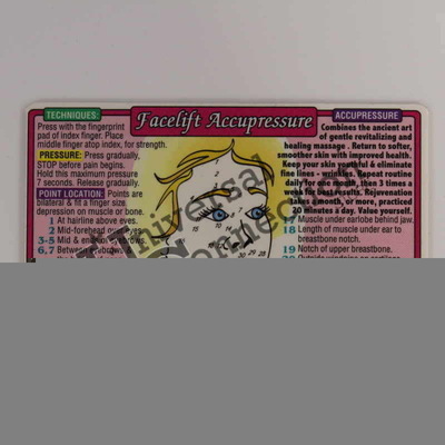 This wallet card is perfect to carry for easy reference of your acupressure therapy for a natural facelift. Acupressure combines the ancient art of gentle revitalizing and healing massage. Return to softer, smoother skin with improved health. Keep your skin youthful and eliminate fine lines and wrinkles. Follow recommended routine for best results. 3" x 2"