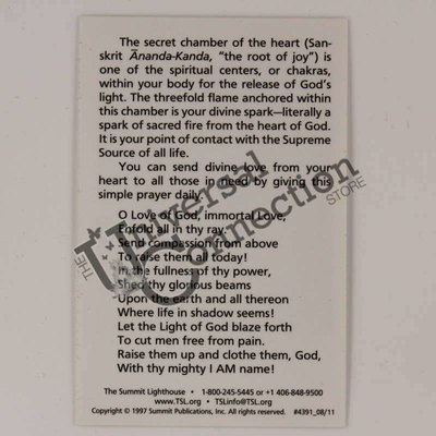 The Secret Chamber of the Heart is one of the spiritual centers, or chakras, within your body for the release of God's light. The threefold flame anchored within this chamber is your divine spark - literally a spark of sacred fire from the heart of God. 3" x 2"