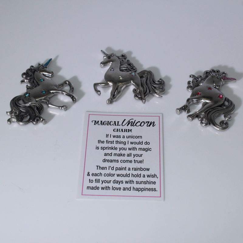 The Unicorn is a mythical creature that brings magic and endless possibilities into our lives. Unicorns embody the gifts of wisdom, possibility, and the clever pursuit of dreams. This charm is perfect to carry or give as a gift to remind us that we can pass through boundaries, see past illusions until truth is revealed, and manifest our dreams into reality. 1.5" x 2"